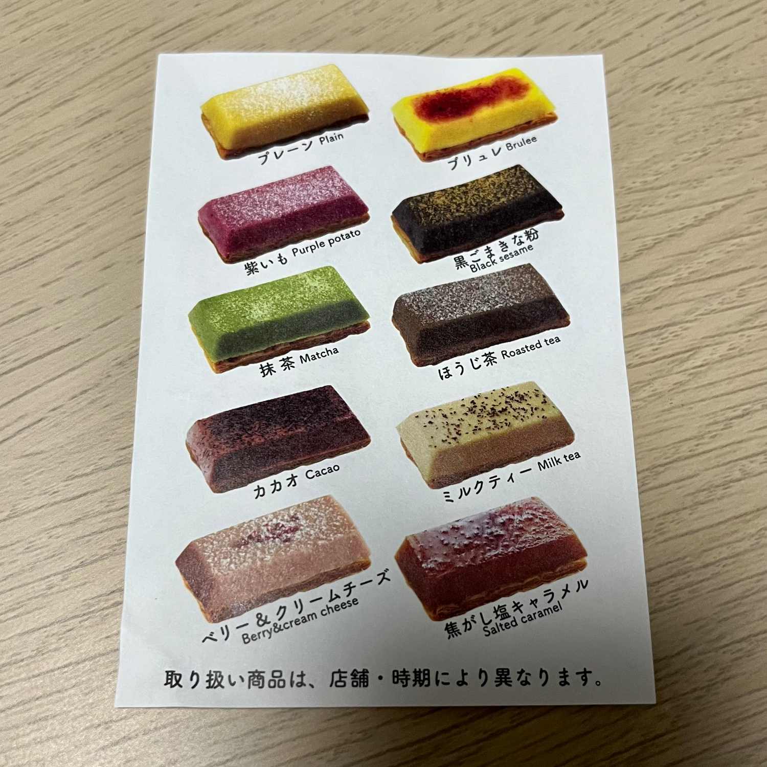 메뉴는 크게 계절 한정 메뉴와 레귤러 메뉴 두 종류가 있는데, 레귤러 메뉴는 플레인, 브륄레, 자색고구마, 꿀흑임자, 말차, 호우지차, 카카오, 밀크티, 베리&크림치즈, 소금 캐러멜이 있었다. 메뉴에 따라서 가격은 조금씩 다른데 대체로 300엔 대 중후반이다.