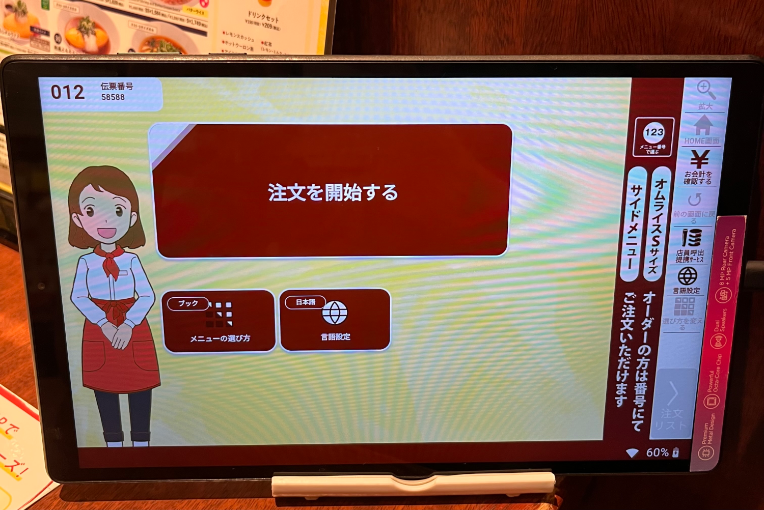 주문은 테이블마다 하나씩 배치되어 있는 태블릿으로 하게 된다. 태블릿 인터페이스는 처음에 일본어, 영어, 한국어, 중국어를 선택할 수 있게 되어있어서 외국인들한테도 접근성이 좋겠다고 느꼈다. 체인점이긴 해도 점포가 많은 체인점은 아니라서 이런 면의 대응은 좀 놀랍긴 했다. 아무리 태블릿을 도입한 곳이라도 기껏해야 영어지 이렇게 인터페이스 언어를 다양하게 제공하는 음식점은 보기 드문데...
