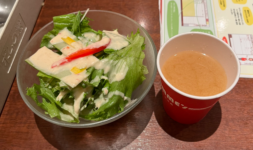먼저 샐러드와 미소시루가 나왔고, 샐러드드레싱은 마요네즈 베이스의 짭짤하고 진한 드레싱이었다. 미소시루는 서비스 메뉴로 조금 작은 종이컵에 담겨 제공되었다.