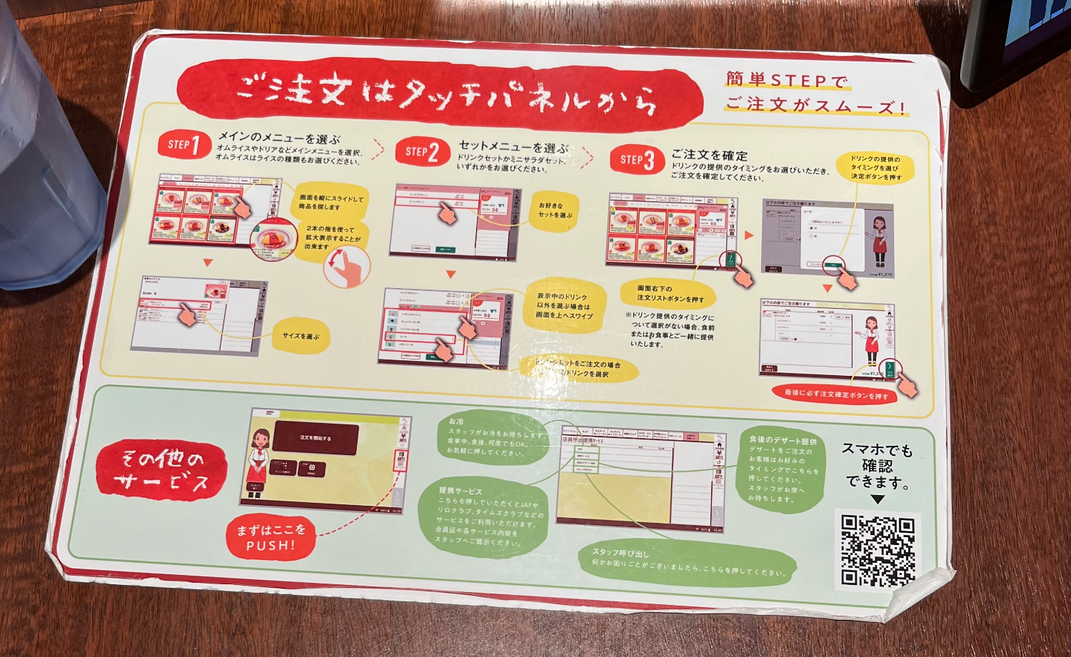 - 다양한 오므라이스 메뉴: 매우 다양한 오므라이스 메뉴를 제공한다. 케첩 라이스나 버터 라이스를 기본으로, 토핑과 소스의 종류가 수십 가지 이상 있어, 기호에 맞춰 커스터마이징이 가능하다. 메뉴가 너무 다양하면 선택이 힘들어서 오히려 꺼려지기도 하는데, 왼쪽 사진처럼 오므라이스 그래프를 제공하여 처음 방문한 사람에게도 선택의 부담을 덜어주려고 하는 노력이 인상 깊었다.