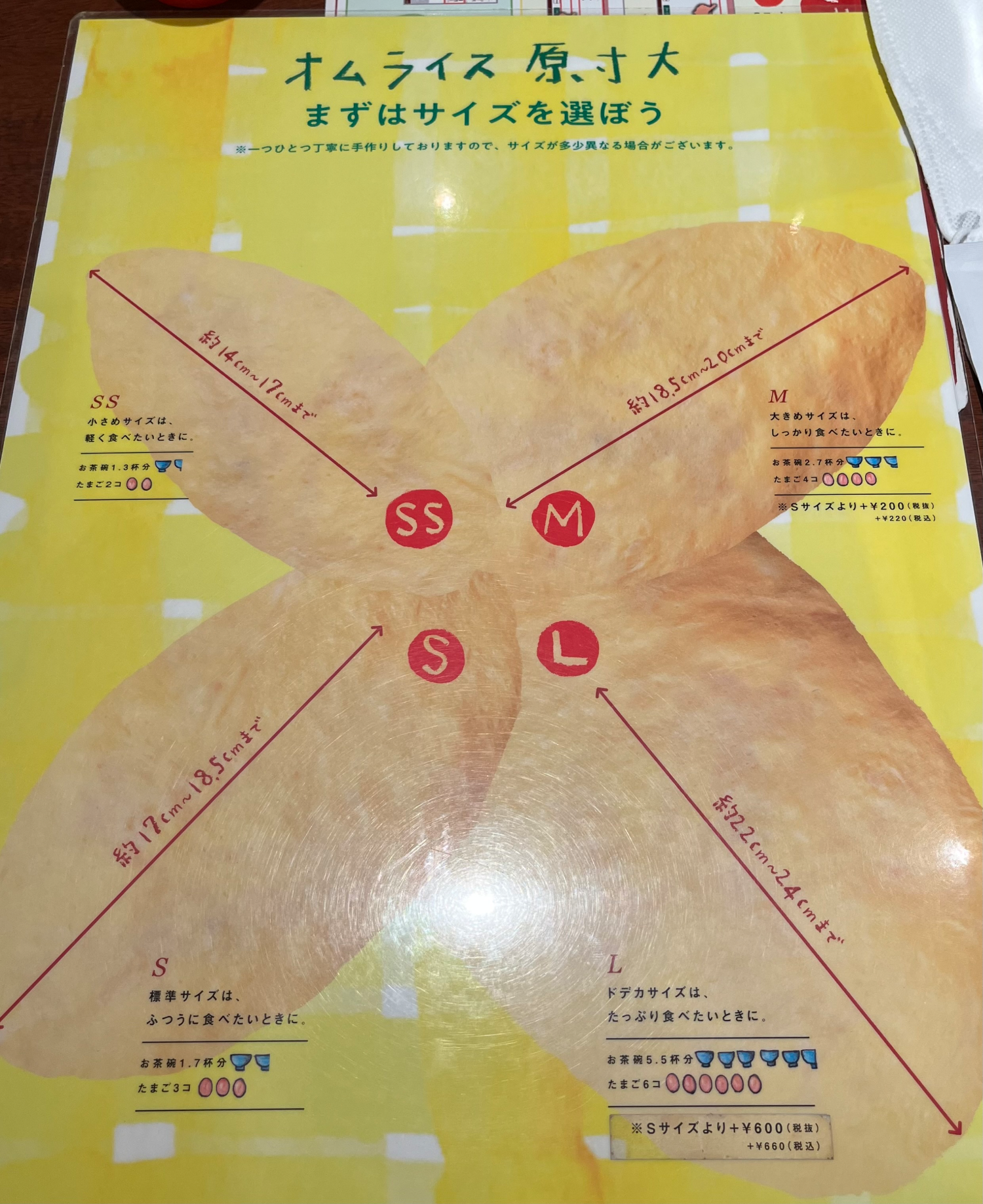 - 사이즈 선택: 오므라이스의 크기를 다양하게 선택할 수 있다. SS사이즈부터 L사이즈까지 배고픈 정도에 따라 선택이 가능하다. SS사이즈는 미니(밥그릇 1.3, 계란 2개), S사이즈가 보통(밥그릇 1.8, 계란 3개), M사이즈가 곱빼기(밥그릇 2.7, 계란 4개), L사이즈가 특대(밥그릇 5.5, 계란 6개) 사이즈이다. 밥그릇은 일본 밥그릇인 오챠왕기준. 밥그릇을 기준으로 써주니 얼마큼 밥을 먹게 되는지 알 수 있어서 좋았다.