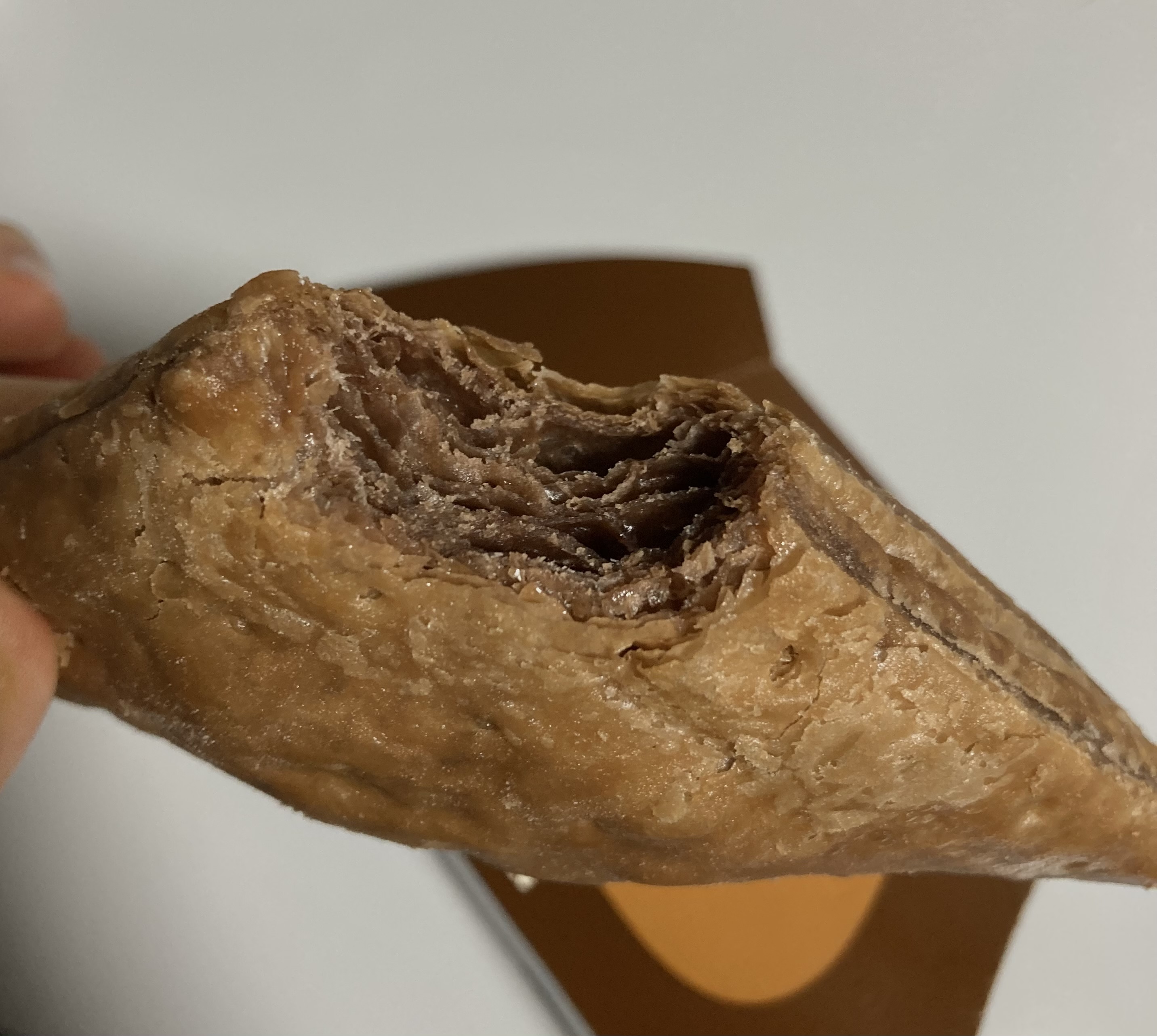 검증 결과 : 첫 입에 소스까지 도달하지 못했다. 결과적으로 소스가 흘러내려 손에 묻는 일은 없었지만, 부스러기 떨어짐에 취약하고, 손에 파이를 직접 쥐어야 하기 때문에 (포장지 활용 x) 손에 기름이 다 묻으며, 위생적이지 않다. 이 방법은 탈락. 다음에 다른 방법을 찾아봐야겠다.