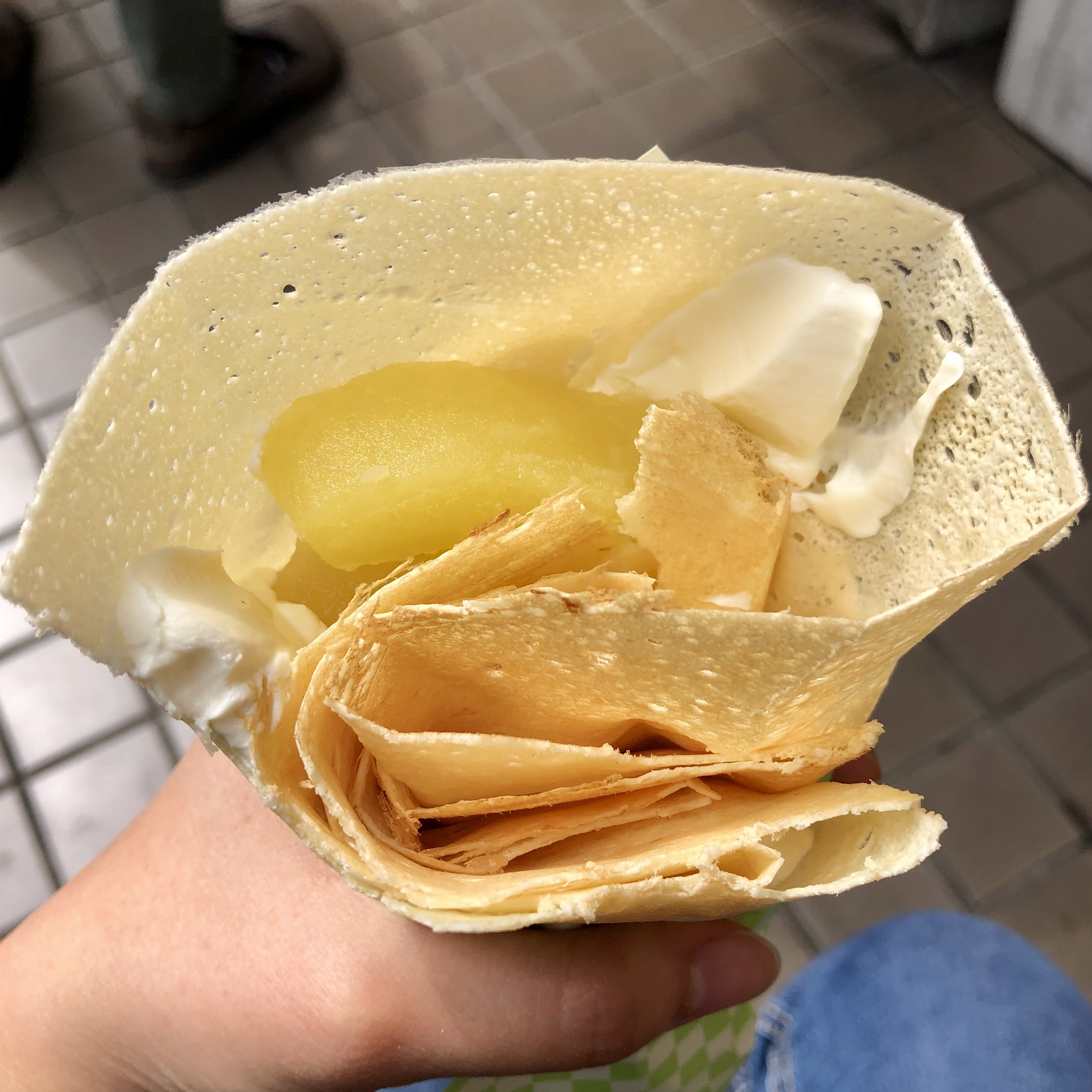 사실 크레페는 반쯤 생크림으로 먹는 맛이 있는 음식이지만, 나는 생크림 불호맨이라 웬만하면 생크림을 빼고 먹거나 커스터드 크림 또는 다른 맛 크림으로 토핑을 변경해서 먹는다. 생크림 빼고 먹을 거면 왜 크레페를 좋아하나... 그건 얇고 쫜득한 크레페의 반죽과 아이스크림이 좋기 때문이다.