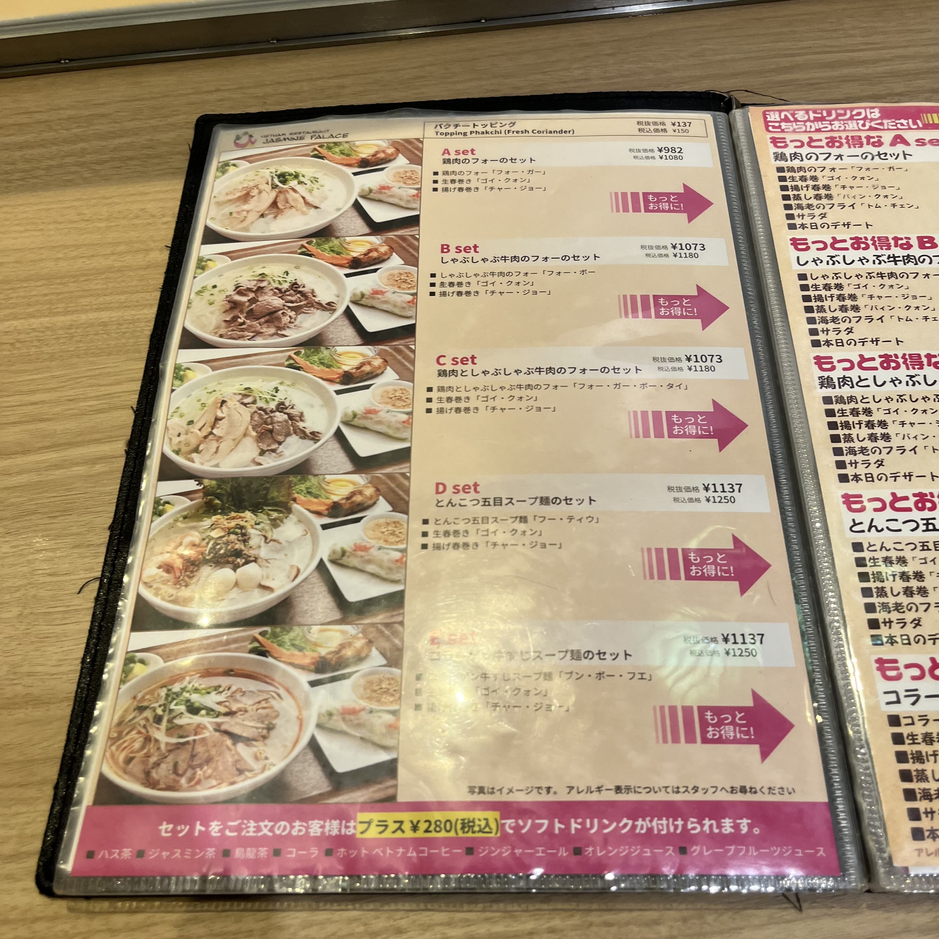 단품메뉴도 많았지만 세트 메뉴는 메인요리에 따라 5종류가 있었는데, 각 세트메뉴마다 일반세트메뉴와 개이득(...) 세트메뉴(가성비 세트메뉴라고 하겠음)로 주문할 수 있었다. 일반세트메뉴는 메인요리(포나 수프면)+생춘권+튀긴 춘권으로 구성되어 있고, 가성비 세트메뉴는 일반 세트메뉴보야 약 1.25배 정도 비싸지만 일반 세트 메뉴+찐춘권+새우튀김+샐러드+디저트+음료로 구성되어 있다.