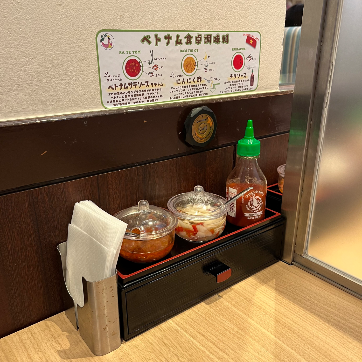 옆에는 식기와 베트남 조미료, 조미료에 대한 설명이 있었다. 준비되어 있는 조미료는 베트남 사테소스, 마늘 식초, 스리라차 3가지. 스리라차는 많이 먹어봤는데 나머지는 처음 봤다. 사테소스는 베트남식 라유이고 마늘 식초는 포에 넣어서 먹는 거라고. 근데 결국 음식 나오고 금방 존재를 잊어버려서 못 먹어 봤다. 다음에 가면 꼭 넣어서 먹어보는 걸로...