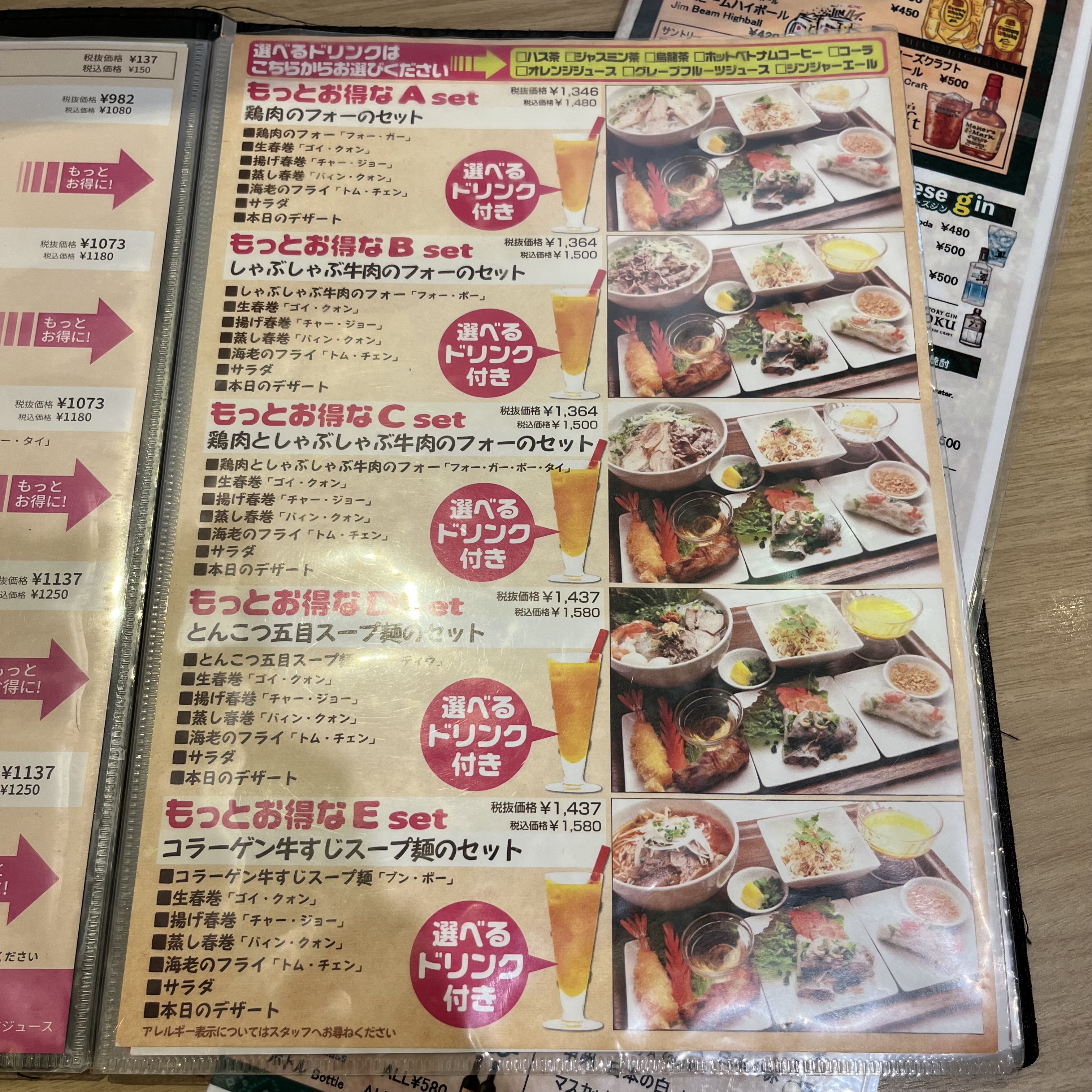 각 세트요리의 메인은 A set : 닭고기 포, B set : 샤브샤브 소고기 포, C set : 닭고기와 샤브샤브 소고기 포, D set : 돈코츠 고모쿠 수프면, E set : 소힘줄 수프면이다.