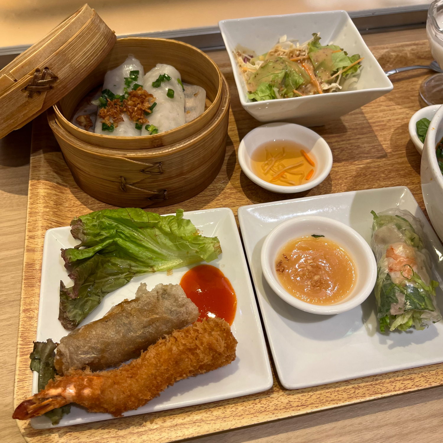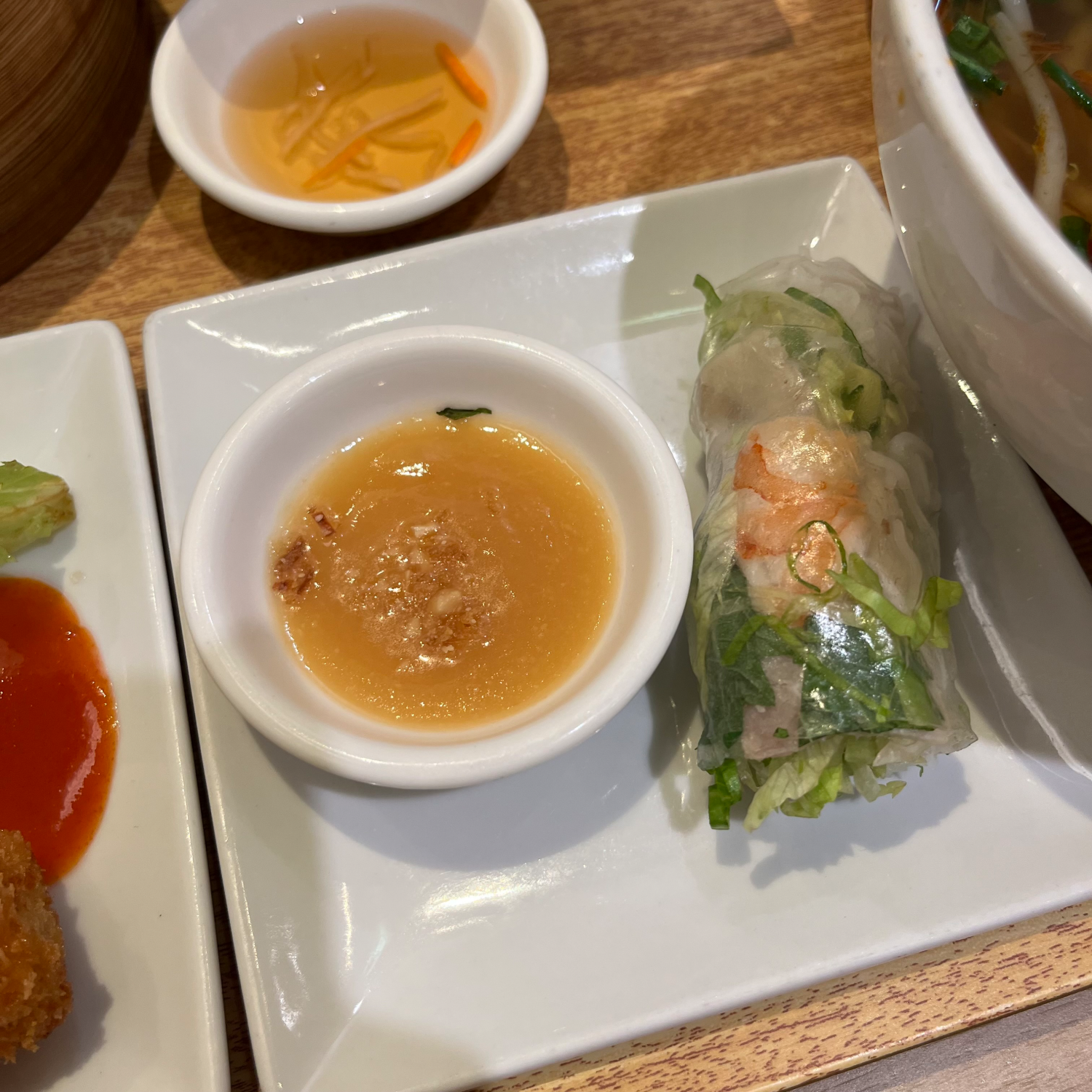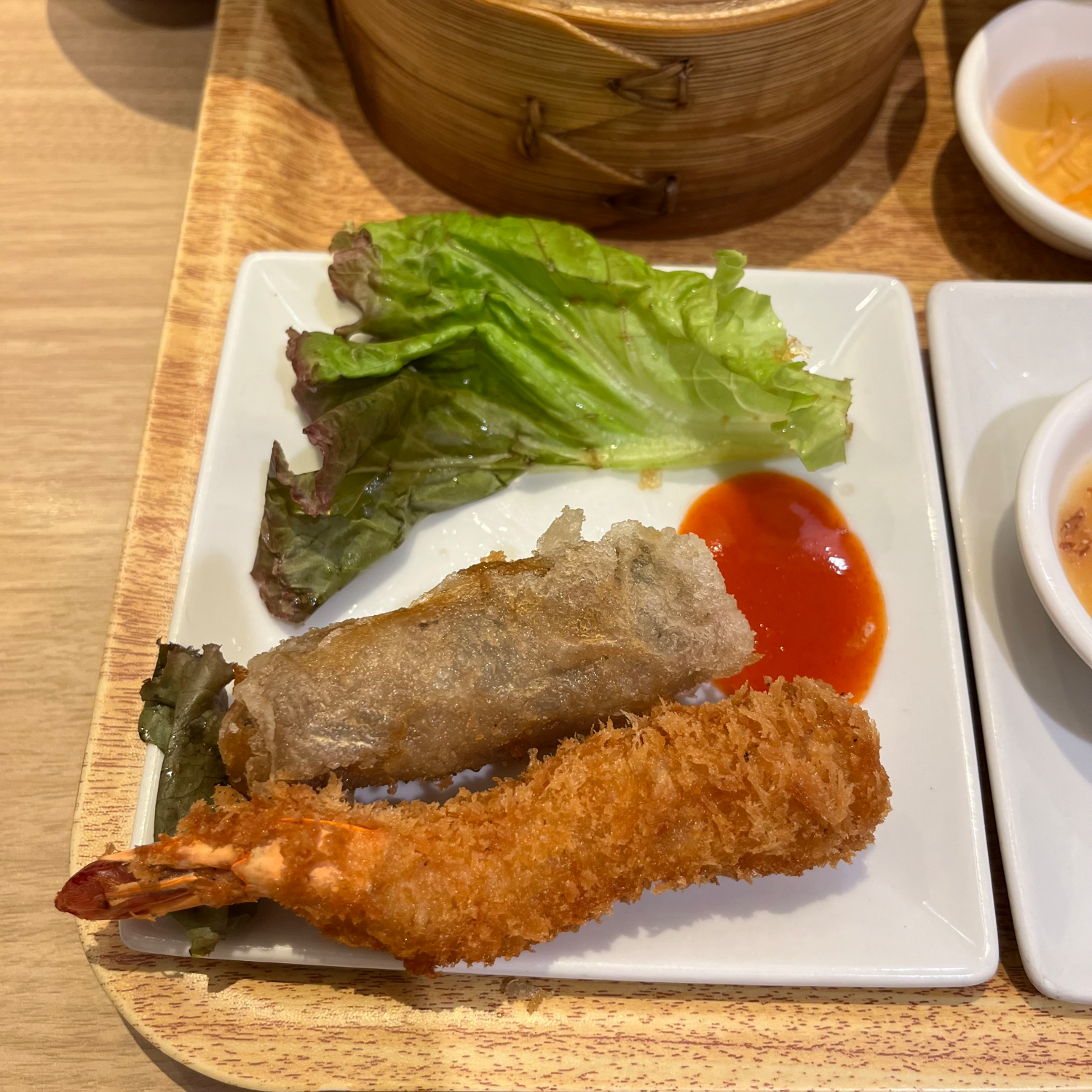 생춘권은 뭐 아는 평범한 맛인데 옆에 소스가 굉장히 맛있었다. 파인애플 맛 같은 게 나는 상큼한 소스였다. 나머지 메뉴도 전반적으로 맛있긴 했지만 개인적으로 하이라이트는 튀긴 춘권이랑 새우튀김이라고 생각한다. 여기는 튀김 맛집... 튀긴 춘권은 안에 츠쿠네(?) 비슷한 게 들어가 있었고, 새우도 새우살이 꽉 차있었는데 좀 시간이 지나서 먹었는데도 진짜 바삭바삭했다. 튀김옷이 얇고 안이 꽉 차있어서 그런가 어떻게 이렇게 잘 튀겼지...