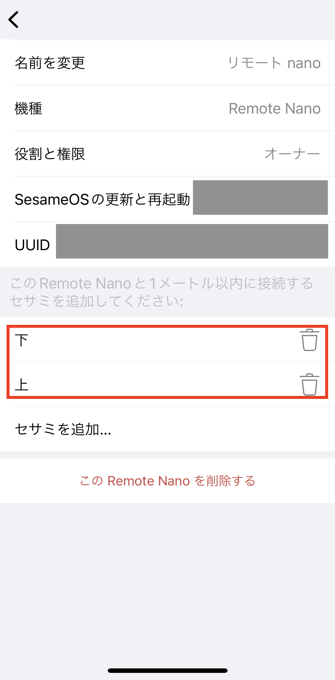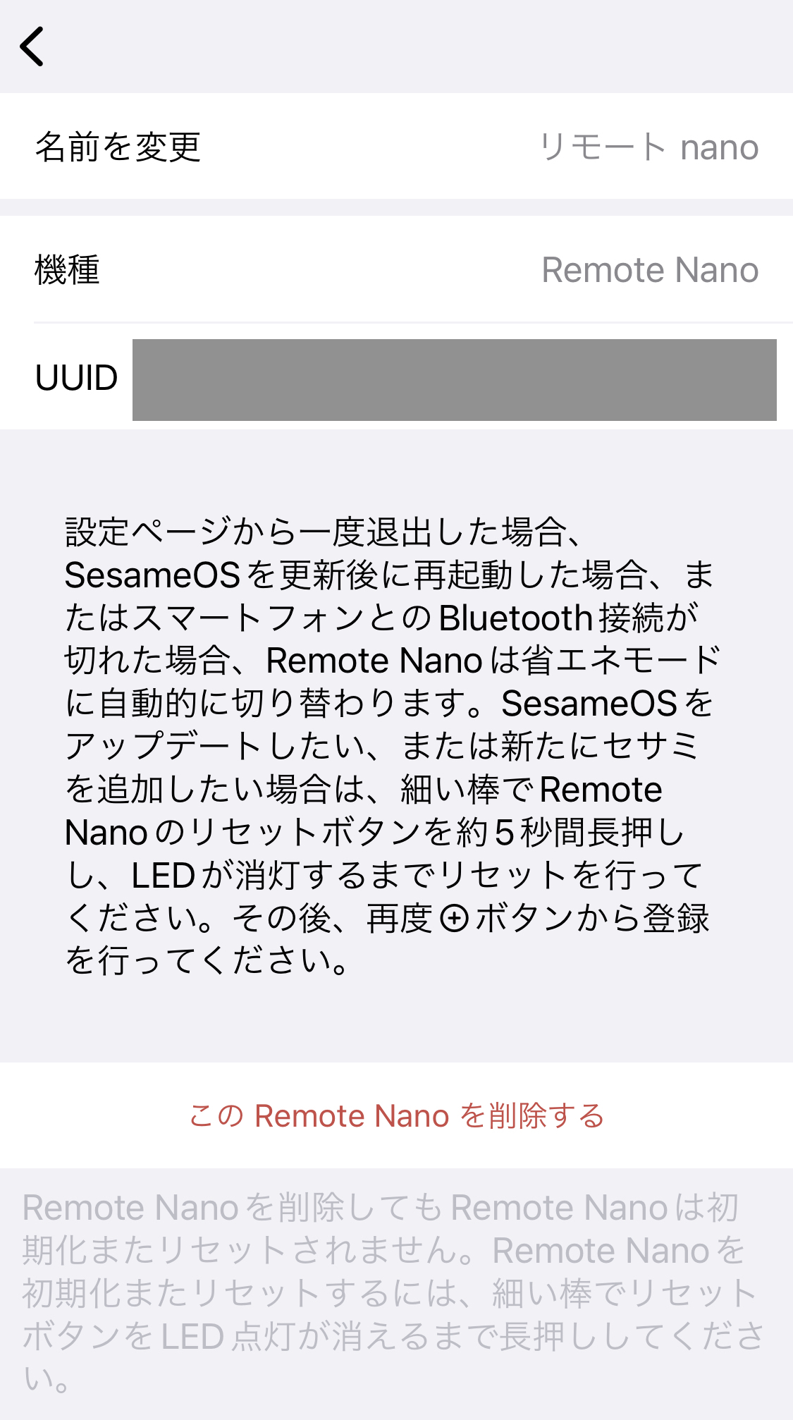 여기서 리모트와는 다르게 주의할 점이 있는데, 리모트 나노의 경우 소에너지 모드를 채용하고 있기 때문에 ①기기 등록 후 설정 페이지에서 나간 경우 ② Sesame OS를 갱신 후에 재기동한 경우 ③ 스마트폰과 블루투스 접속이 끊겼을 경우, 자동적으로 소에너지 모드로 전환되게 된다. 리모트 나노가 소에너지 모드로 전환된 경우에는 설정 페이지에서 설정을 갱신할 수 없고, 무조건 앱에 등록된 리모트 나노 기기를 삭제 후 리셋을 시켜준 다음에 앱에 재등록해줘야 한다.