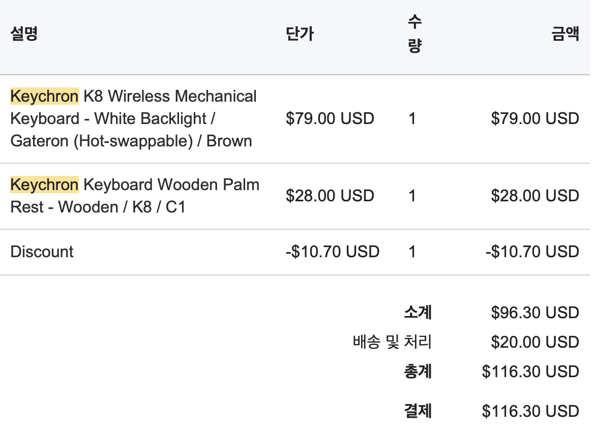 키크론 공식 홈페이지에서 구매하였고, DHL Express로 배송이 되었는데 주문부터 배송까지 이틀이 걸렸다. 주문을 하면 발송 지점에 따라서 배송속도가 다르다고 안내가 오는데, 내 물건은 홍콩에서부터 배송이 되는 물건이었고 홍콩의 경우 3일에서 7일 정도가 걸린다고 되어있었다. 근데 실제로는 이틀 만에 와서 깜짝 놀랐다. 구웃 서프라이즈. 가격은 키보드 가격 79달러+팜레스트 28달러인데, 할인을 10.7달러 받아서 배송비 20달러 포함 116.3달러로 구매하였다.