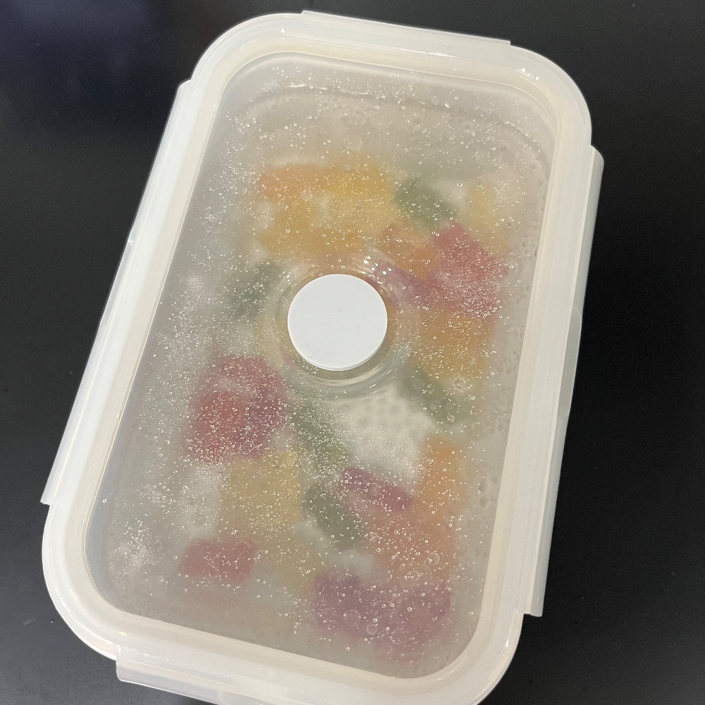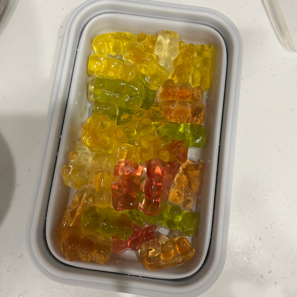 용기에 뚜껑을 덮어 하루(24시간) 정도 불려준 결과가 밑에 사진이다. 불어서 색이 조금 투명해지고 뚱쭝해졌다. 이제 사이다를 버리고 젤리들만 남겨준다.
