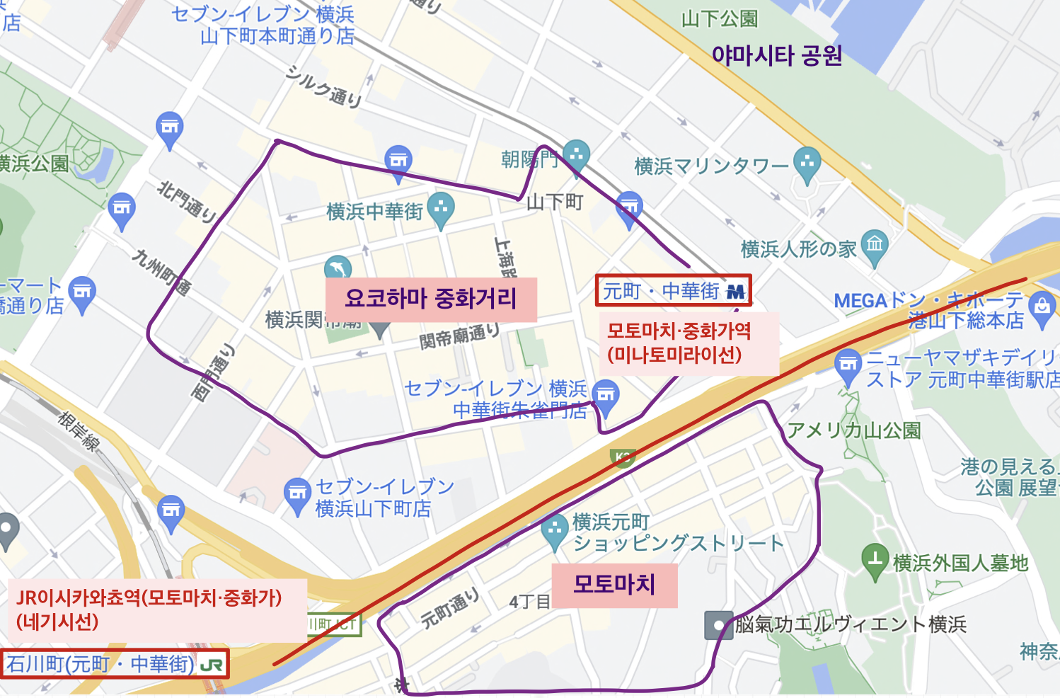 JR과 지하철로 접근이 가능해서 교통편도 편한데, 지하철 미나토미라이선을 타면 모토마치 메인 스트릿으로 바로 이어지는 출구가 있다. 메인 스트릿에 옷 가게나 잡화점을 비롯한 다양한 가게들 부터 골목골목으로 들어가면 음식점이나 카페도 많다. 사실 딱히 쇼핑을 좋아하지는 않지만 근처에 한국 영사관이 있어서 (JR에서 내려 영사관을 가는 길이 모토마치) 안어울리게 많이 가 봤다.