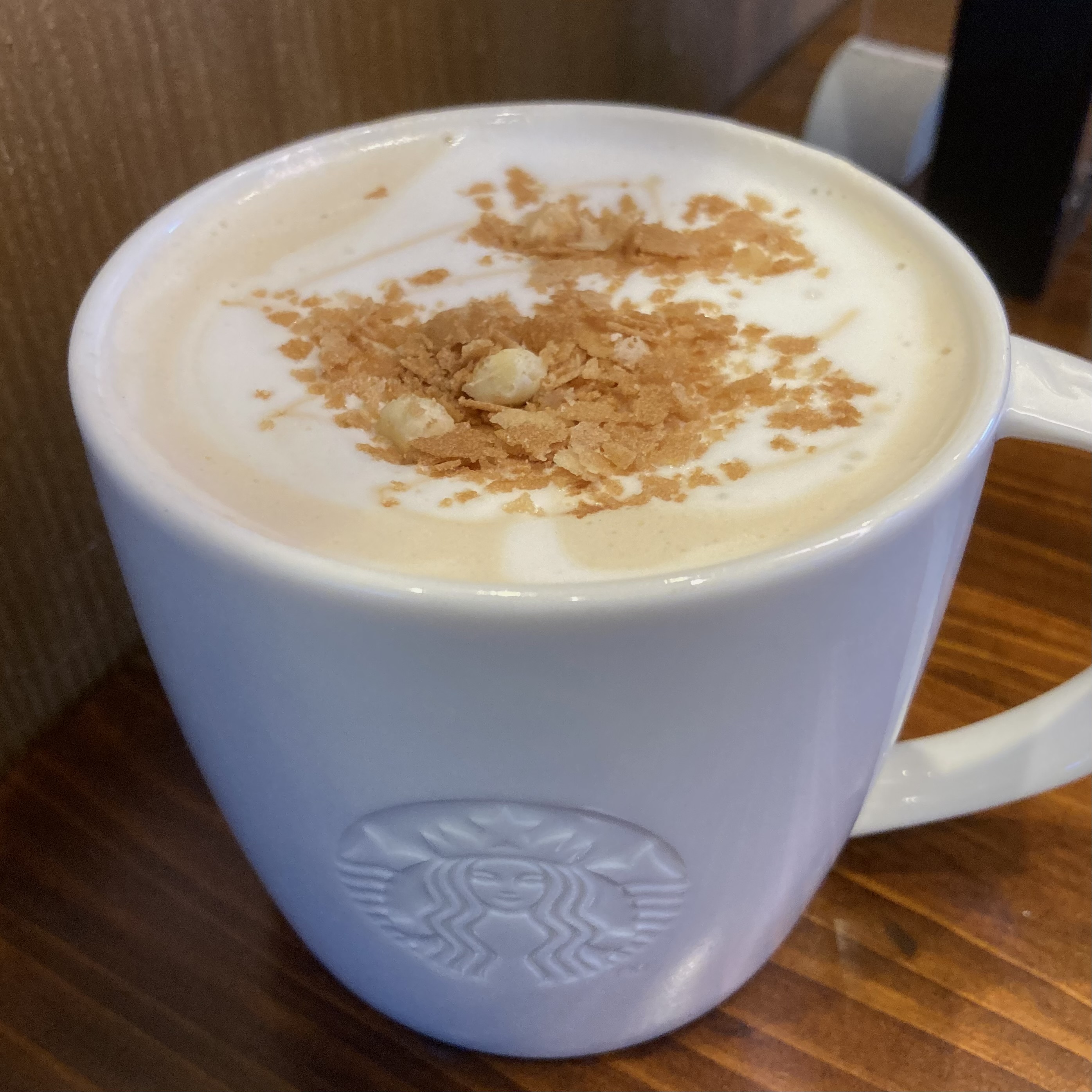 휘핑크림을 웬만하면 빼먹는 사람으로서 휘핑크림을 빼면 비주얼이 다운그레이드 되는 게 역시 항상 아쉽긴 하다. 위에는 캐러멜소스(가라앉아서 안보임)랑 파이크럼&휘앙티누를 뿌려주는데, 대체 휘앙티누(フィアンティーヌ)가 뭐냐 싶었지만 상품 소개 페이지에 친절하게 설명이 쓰여있었다. 크레이프 반죽을 얇게 펴서 구워 잘게 부순 음식이라고. 프랑스어인 듯하다. 맛은 토핑을 추가해 좀 업그레이드된 캐러멜 마키아토(핫) 정도? 버터 캐러멜이라는 이름이긴 했는데, 버터 풍미가 강하게 느껴지지는 않았다.