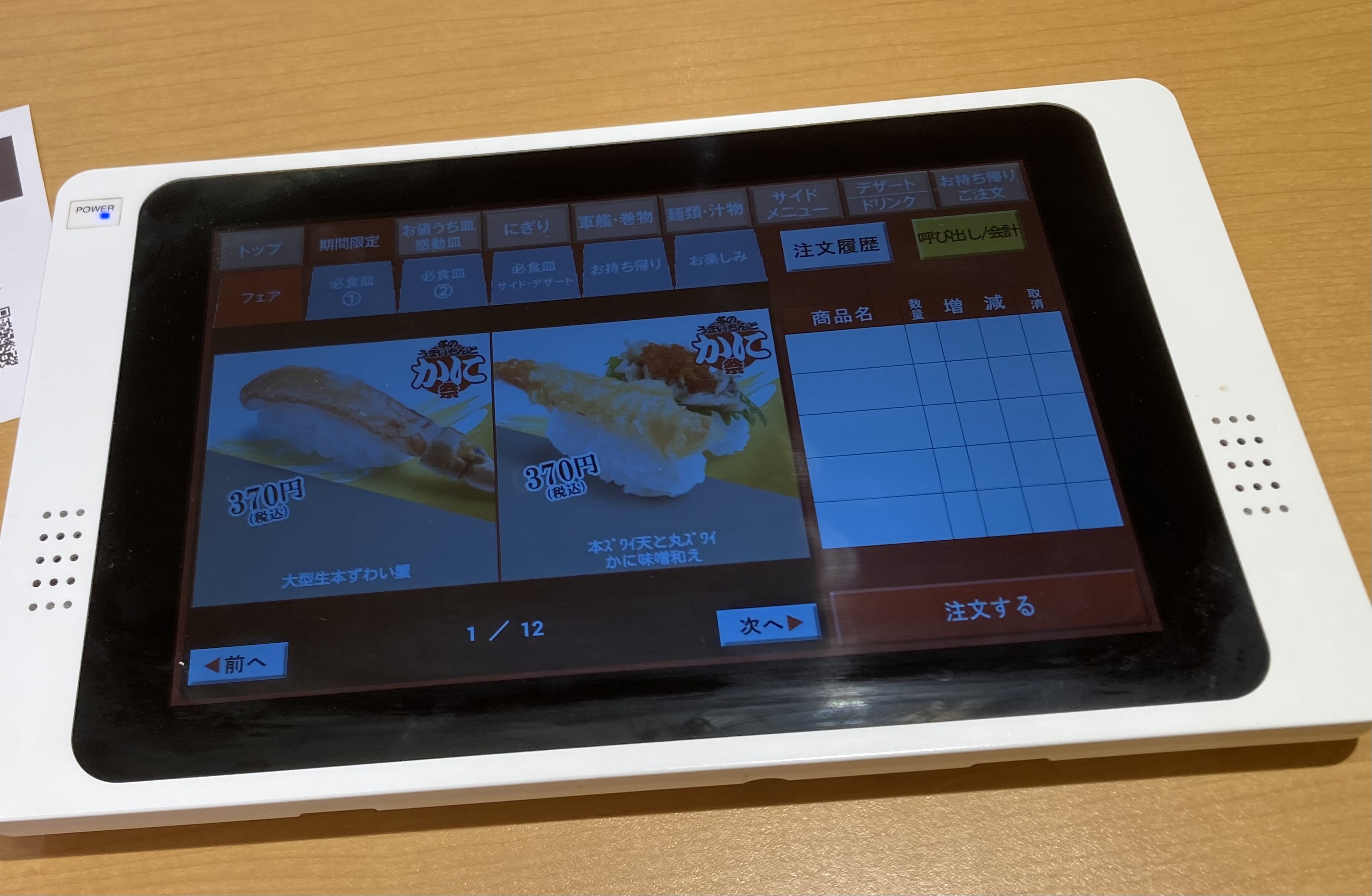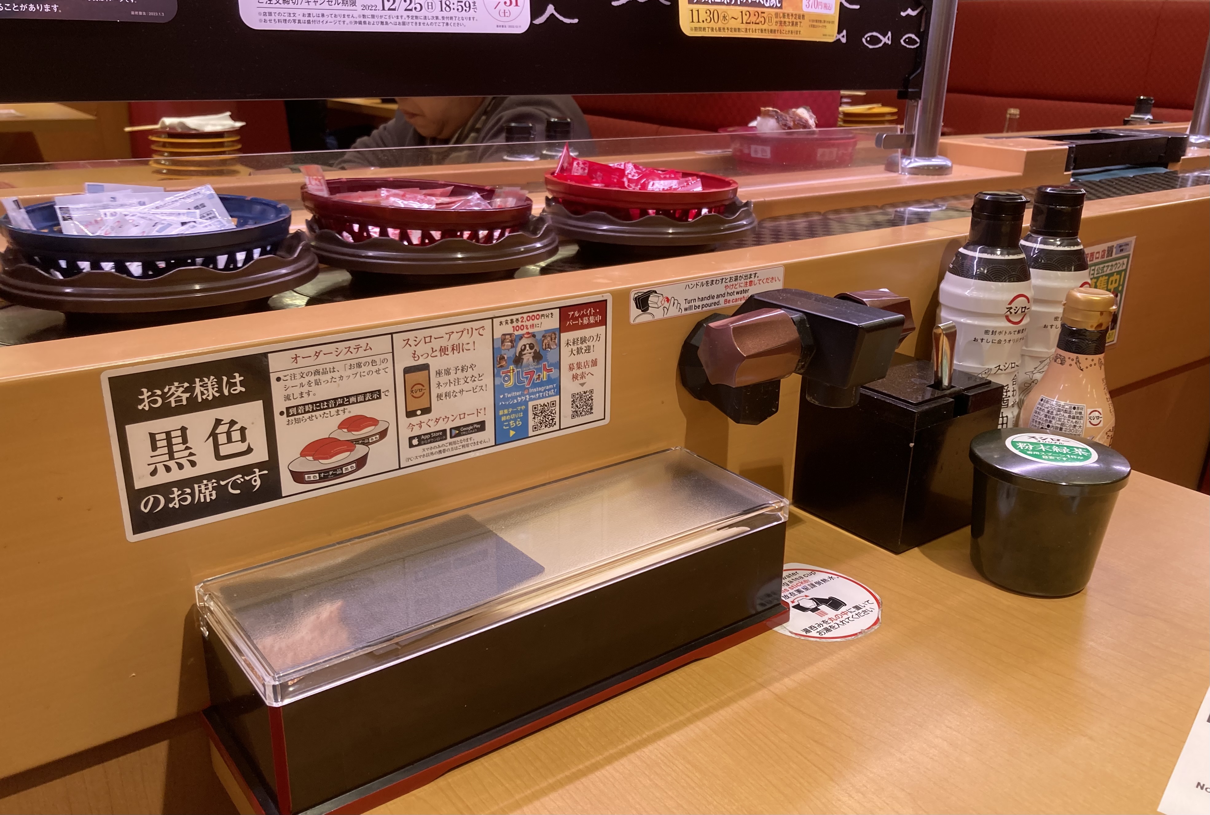 대역병 시대가 도래한 후부터는 회전 중인 초밥은 절대 안 먹고 테블릿으로 주문해서만 먹는다. 주문한 초밥은 주문용(?) 그릇에 담겨서 회전레일을 통해 내 앞으로 배달이 된다. 테이블마다 지정된 색이 있어서 그 색의 라벨이 붙어있는 그릇이 있는데 그게 주문용 그릇. 주문한 메뉴가 내 근처까지 오면 곧 주문한 상품이 도착한다고 테블릿으로 알려준다. 그럼 보고 있다가 레일에서 낚아채면 된다. 이 때, 챠왕무시 같은 용기가 뜨거운 메뉴의 경우 주문용 그릇 통째로 집어오고, 그냥 스시나 디저트일 경우는 주문용 그릇까지 가져오면 안 되는 등 메뉴에 따라 픽 업 룰이 다르다. 테블릿으로 도착 예정 안내를 해주면서 레일에서 가져올 때 주의점에 대해서도 다 이야기해주기 때문에, 일본어가 가능하다면 알기 쉽지만 아니라면 뭐가 뭔지 모를 수 있다.