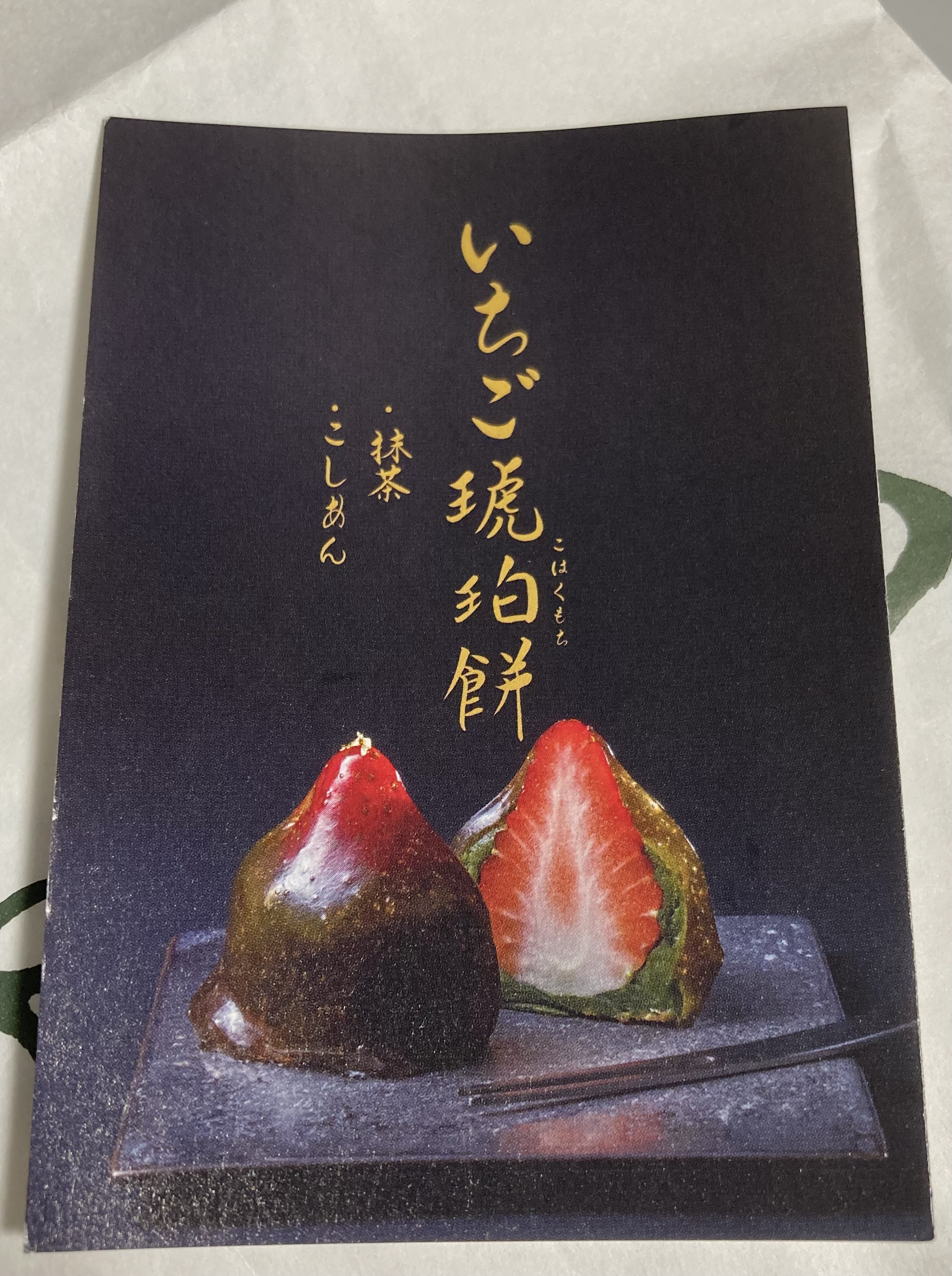 말차 디저트를 주로 파는 쿄하야시야(京はやしや)라는 가게가 있는데, 못 보던 디저트가 있어서 구매해 봤다. 이치고코하쿠모찌(いちご琥珀餅)라고, 딸기에 앙금을 발라 흑당 와라비 모찌로 감싸놓은 디저트이다. 앙금은 말차앙금과 코시앙 2종류고, 가격은 둘 다 648엔. 기간한정 상품이고, 일부의 점포에서만 판매하는 듯하다.